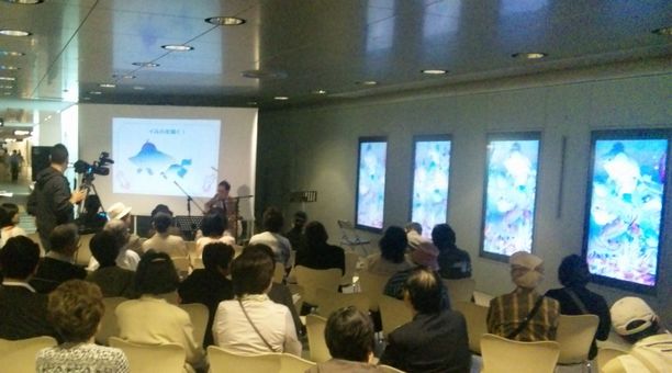イベントでは西側6面ディスプレイをバックに、イラスト制作デモンストレーション・映像作品発表・イラストライブ・映像の元となった詩の朗読・セミナーが行われ、多数の観客の皆様が集まりました。