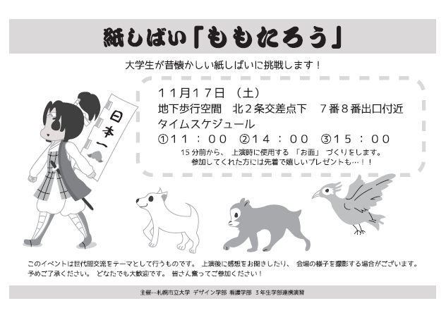 ・内容:広場の西側では、札幌市立大学様の学生さんによる紙しばいが披露され、15分前からはお面作りのワークショップが開かれます。