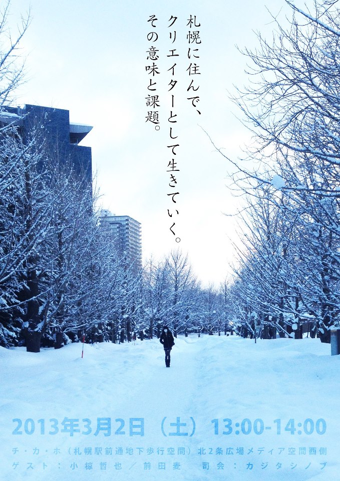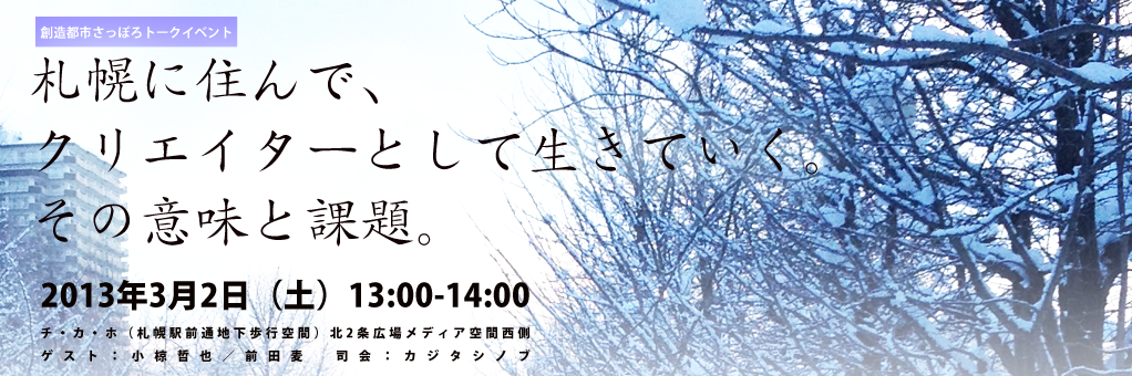 日本の中心から離れた"札幌"でクリエイティブを仕事とする方々をお招きし、なぜこの地に居るのか、なぜこの地から東京へ去る人が多いのか、それぞれの立場からお話を伺います。