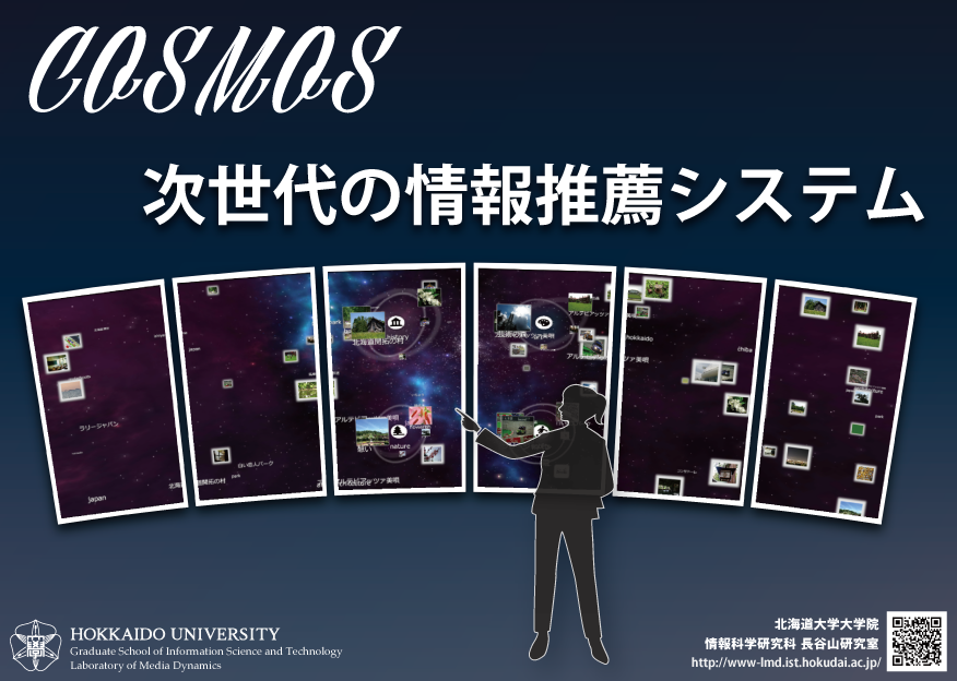 あなたが、ディスプレイに表示される文字や画像、映像などの情報を閲覧したり選んだりする動作によって、『COSMOS』が好みを推定し、映像を推薦します。あなたが選択を繰り返すと、『COSMOS』があなたのために、新しい映像の世界を創り出します。