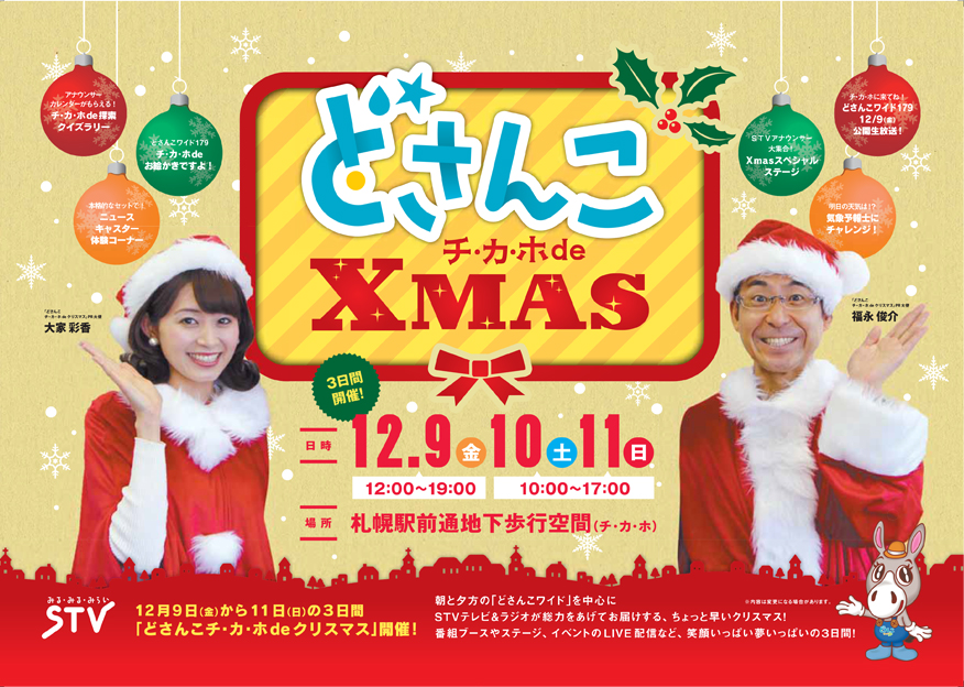 チ・カ・ホ北2条広場メディア空間"Sapporo-north2"では、12/9(金)~11(日)開催のSTV様によるチ・カ・ホ全館イベント「どさんこ チ・カ・ホdeクリスマス」の一環として、イベントブースが設置されます!