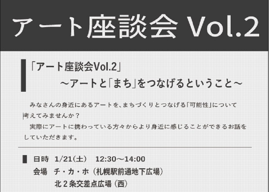 チ・カ・ホ北2条広場メディア空間"Sapporo-north2"では、1/21(土)に札幌市市民文化局市民自治推進課様によるトークイベント「アート座談会Vol.2」が開催されます!