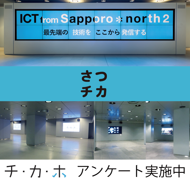 チ・カ・ホ(札幌駅前通地下歩行空間)北2条広場"Sapporo*north2"では10/25(木)に、チ・カ・ホ、同空間のデジタルサイネージ、同空間向けアプリ、に対するアンケートを実施します。