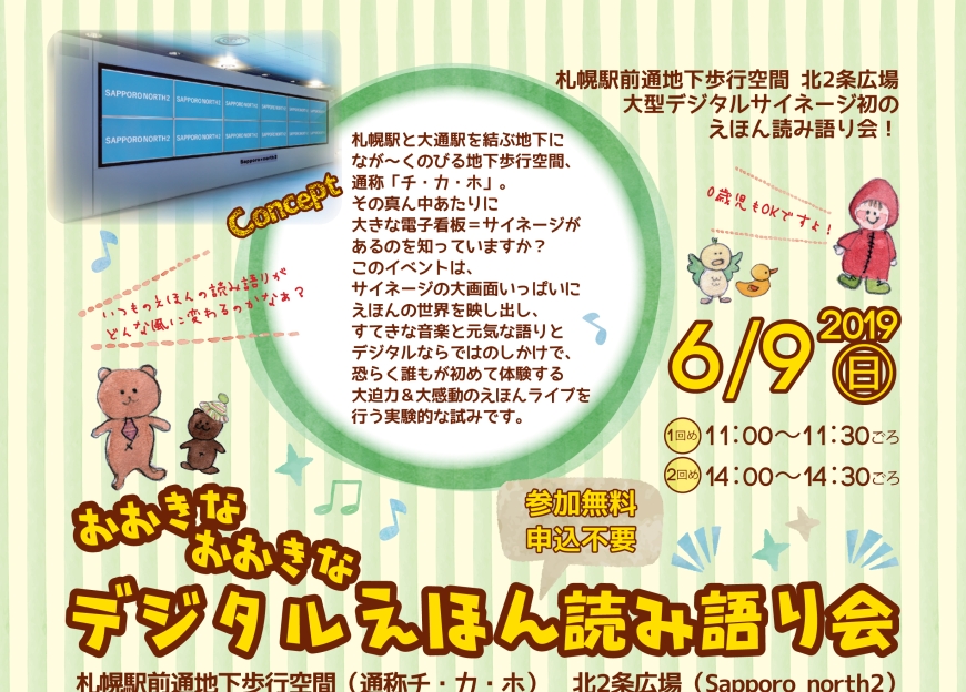 チ・カ・ホ(札幌駅前通地下歩行空間)北2条広場"Sapporo*north2"では、6月9日(日)にサイネージ絵本プロジェクト様による「おおきなおおきなデジタルえほん読み語り会」イベントが開催されます!