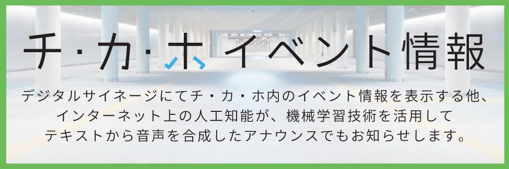 アンケート回答のご意見を基に、チ・カ・ホWEBサイト、及びチ・カ・ホ北3条東側の縦型タッチパネルコンテンツ「チ・カ・ホ 情報 タッチしてキャッチ」で提供されているイベント情報を掲載すると共に、ICT活用のひとつとしてインターネット上のAI(人工知能)が機械学習技術を活用してテキストから音声を合成したアナウンスからも、イベント情報を読み上げてお知らせします。