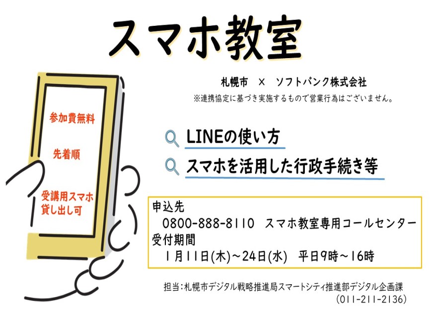 本イベントは総務省の「デジタル活用支援推進事業」で、LINEの使い方・スマホを活用した行政手続き・札幌市公式アプリなど、スマホの応用的な操作について学ぶことができるスマホ教室を開催します。